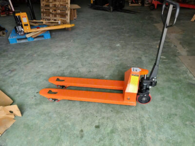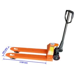 Xe nâng tay háng hẹp 450mm càng nâng dài 1150 mm – Là mẫu xe nâng có kích thước phủ bì ngang nhỏ hơn các loại xe nâng tay thấp thông thường khi kích thước phủ bì ngang của xe nâng chỉ là 450 mm và lọt lòng giữa hàng càng nâng là 130 mm.